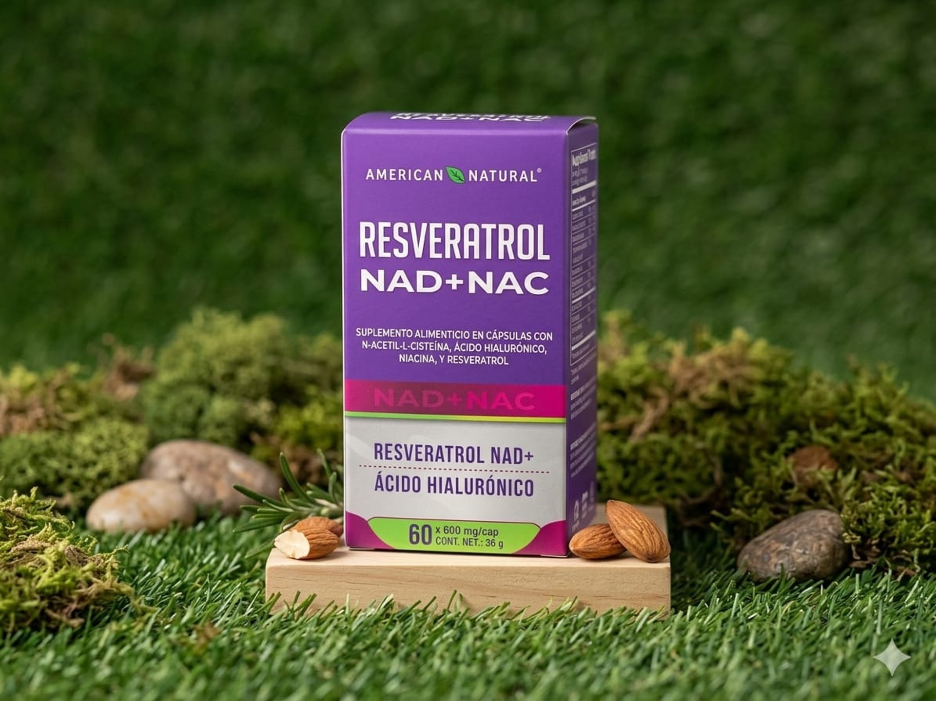 Suplemento alimenticio en cápsulas de la marca American Natural, formulado con Resveratrol, NAD+, N-Acetil-L-Cisteína (NAC), Ácido Hialurónico y Niacina.